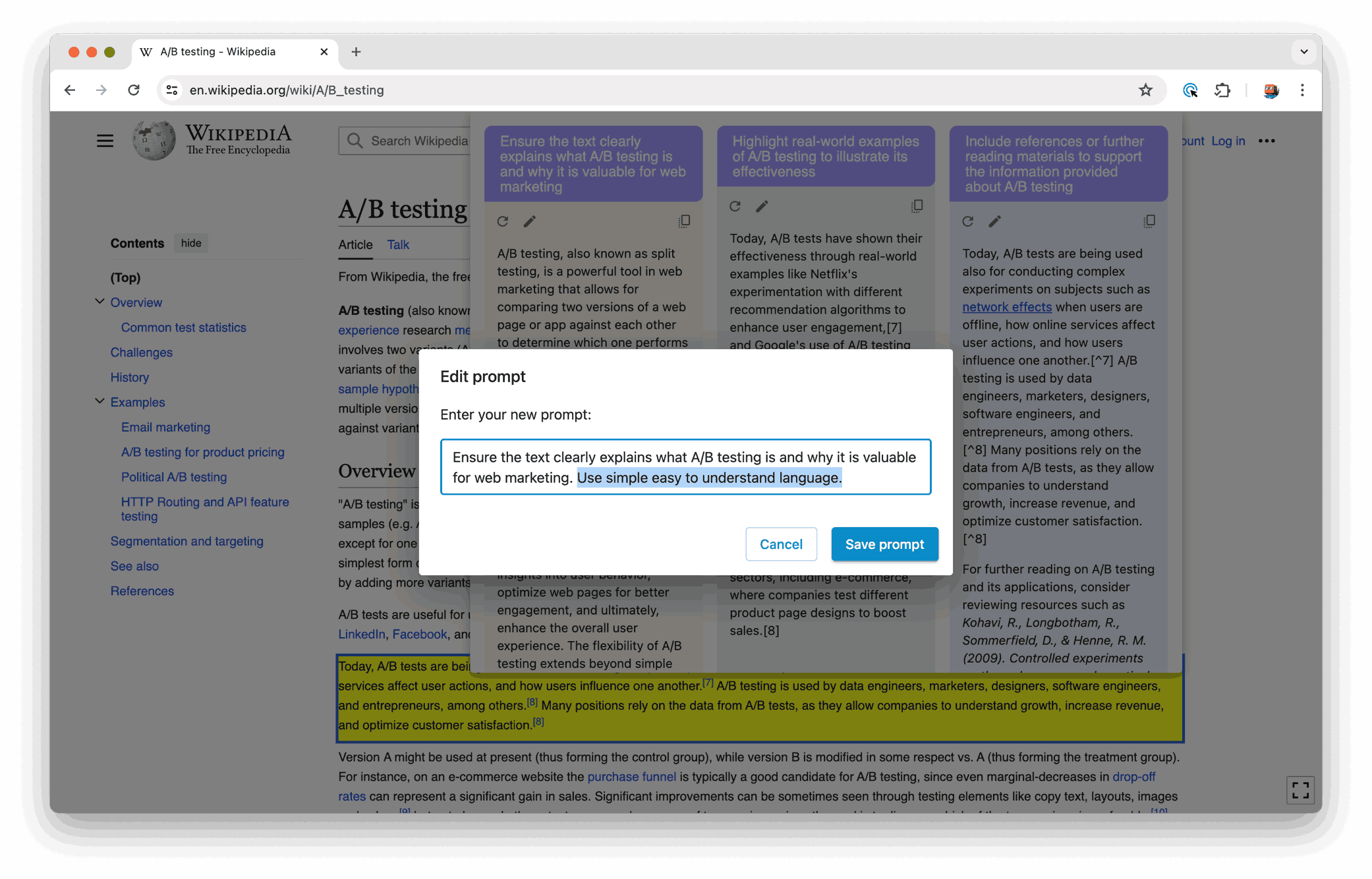 The extension automatically generates prompts for each web page. You can edit them by clicking on them.